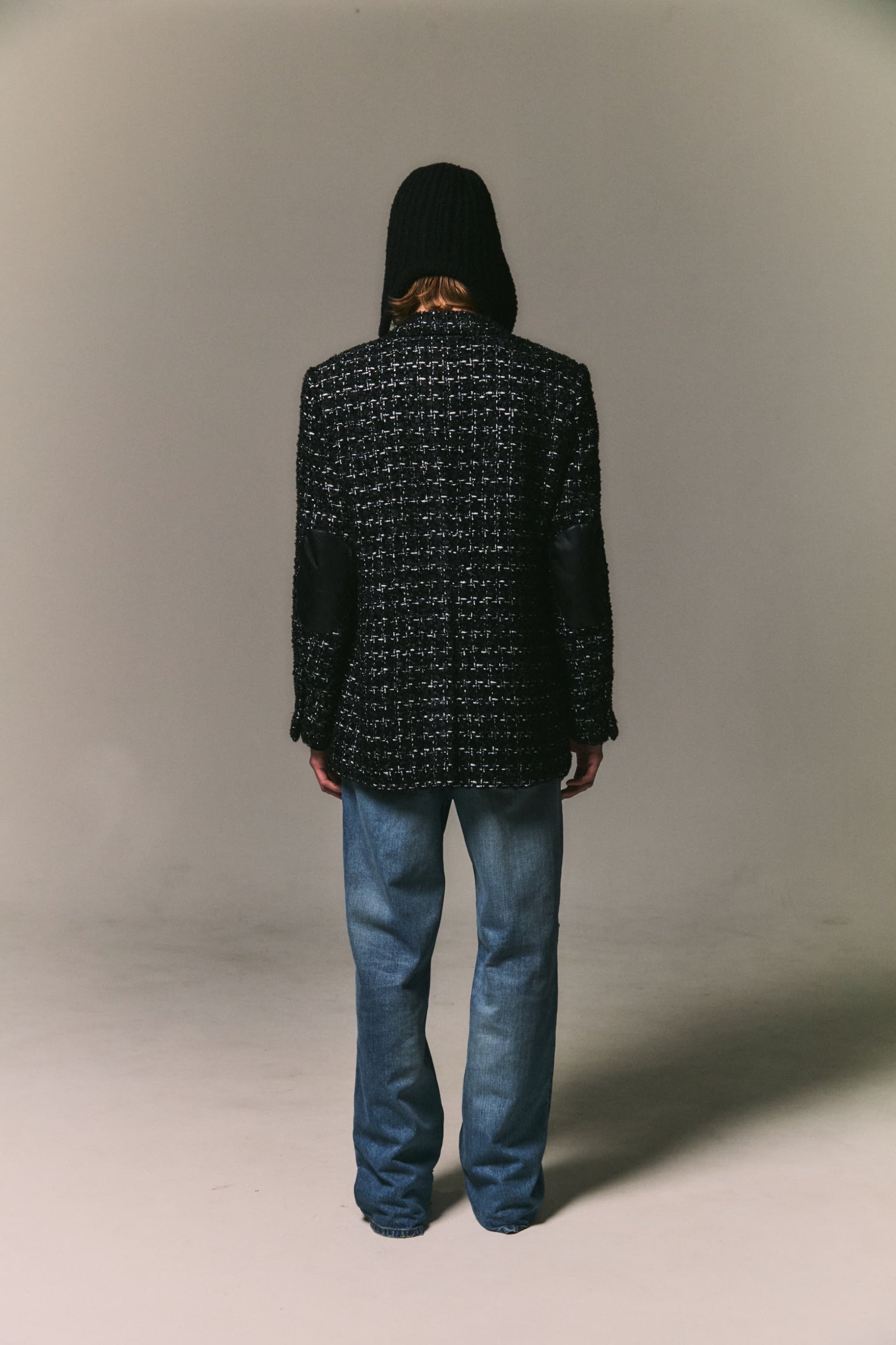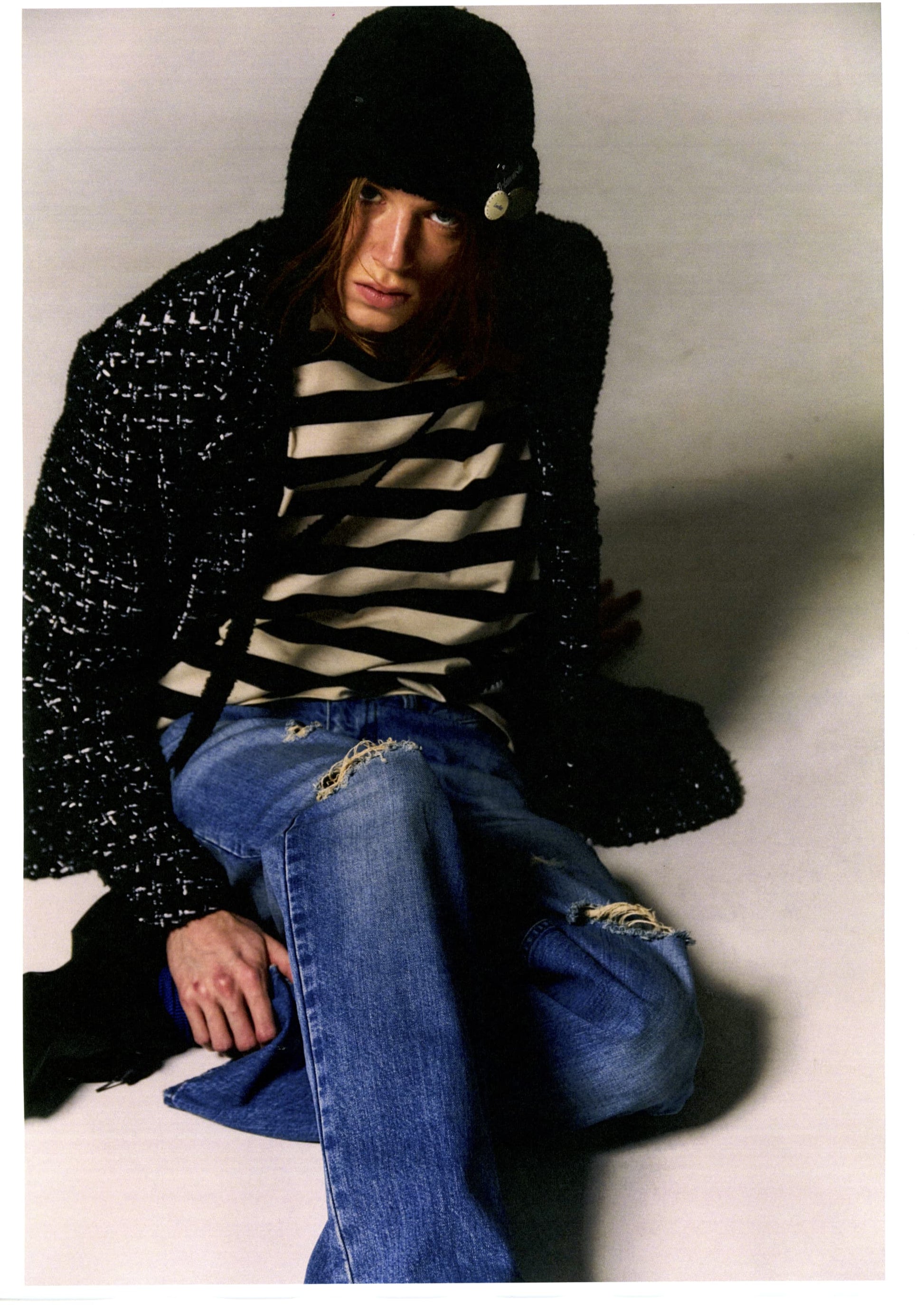 カーディガンと同じブークレ糸を使用した、ニットフライトキャップ。